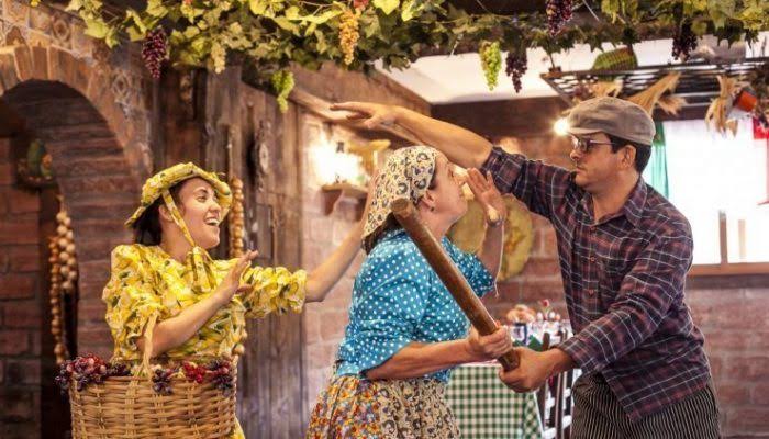 Em meio ao clima acolhedor e decoração detalhista você irá se fartar com o delicioso buffet típico regional Italiano composto por sopa de capeletti, variedade de massas e molhos, polenta mole e recheada, lasanha, paleta suína, ossobuco, galinha à moda Italiana, além de uma vasta mesa de queijos, salames, saladas e antepastos, não podendo esquecer das nossas sobremesas com sabor das delícias da nona que nos remetem à boas recordações. Durante o jantar você terá o prazer de ouvir clássicos italianos cantados por um tenor e uma soprana, dançará com a gente as músicas America e La Bella Polenta e sentirá a energia única que nossa casa tem. Por fim, irá apreciar um teatro divertidíssimo que conta a história de uma família italiana do interior que está se adaptando com as modernidades da cidade.